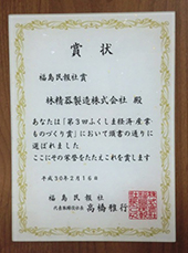 最高賞である知事賞をはじめとして、福島民報社賞、福島民報社奨励賞、金賞、銀賞、特別賞と、各賞にわたって県内各地の様々な企業が選ばれます。第三回では、林精器製造(福島民報社賞)を含む計40社が受賞しました。